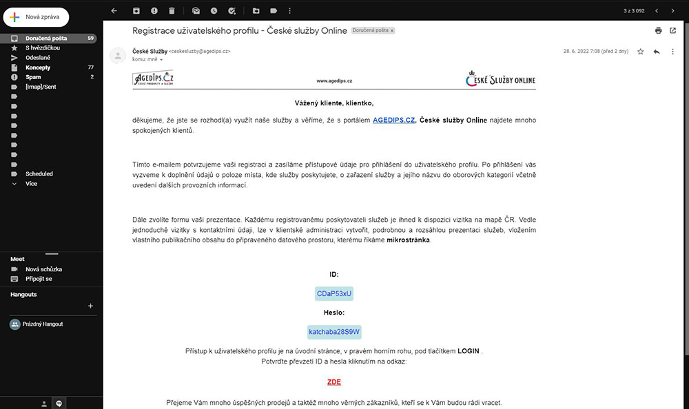 Za několik minut po uložení přijde do vaší e-mailové schránky registrační e-mail (11) s přístupovými údaji do uživatelského profilu. Po kliknutí na odkaz ZDE, se otevře logovací stránka.