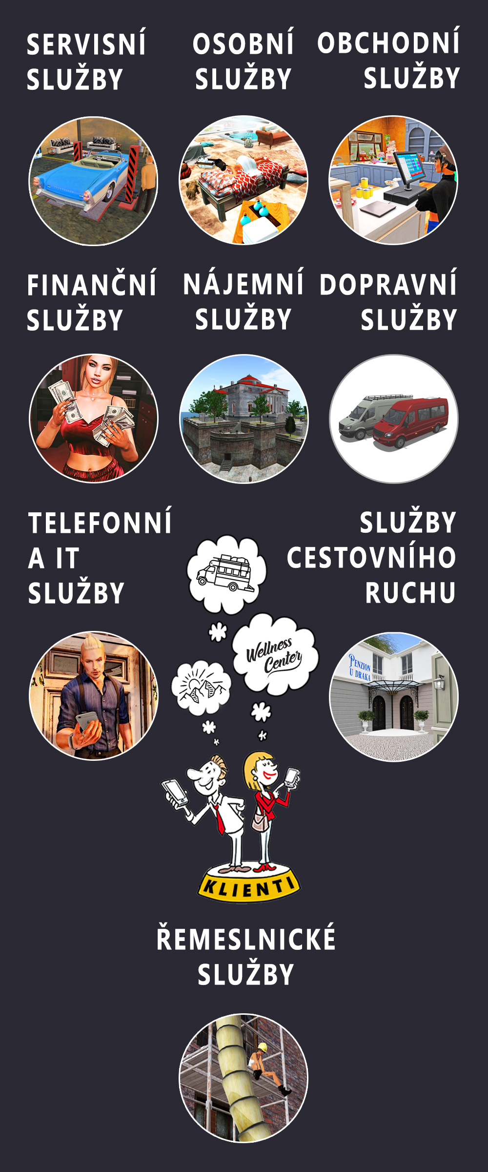 Databáze názvů služeb, se rozšiřuje automaticky průběžně při registraci každého nového poskytovatele. V současné době je každý typ služby rozdělen do několika oborů. U servisních služeb jsou to obory: PNEUSERVISY, AUTOOPRAVNY. U osobních služeb: PORADENSTVÍ, LÉČITELSTVÍ. U obchodních služeb: PRODEJNY LAHŮDEK, KNIŽNÍ VELKOOBCHOD. U řemeslnických služeb: KREJČOVSTVÍ, OPRAVNA ELEKTRONIKY. U dopravních služeb: PŘEPRAVA CENIN, DOPRAVA OSOB, PŘEPRAVA VĚCÍ. U nájemních služeb: PRONÁJEM VOZIDLA, PRONÁJEM BYTU. U telefonních a IT služeb: DATOVÉ SLUŽBY, TVORBA DATOVÉHO OBSAHU. U finančních služeb: FINANČNÍ PORADENSTVÍ, INVESTIČNÍ PORADENSTVÍ. U služeb cestovního ruchu: UBYTOVACÍ SLUŽBY.